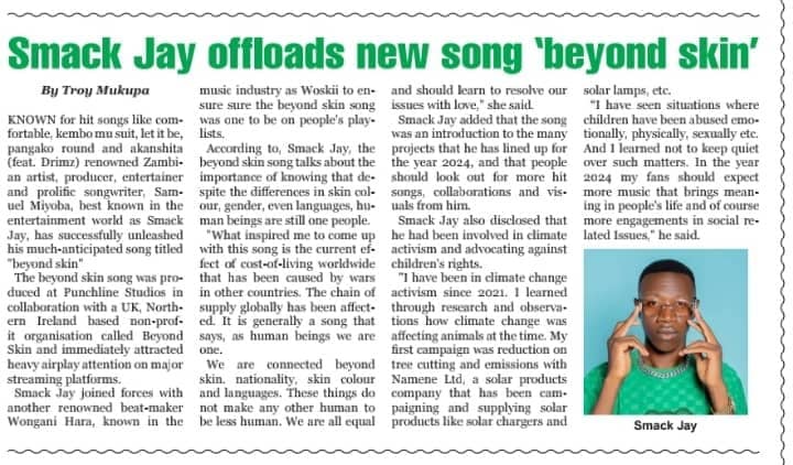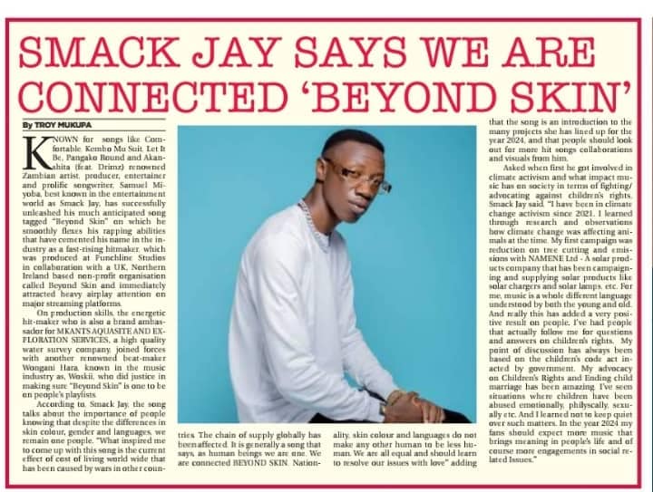 My name is Samuel Miyoba better known as Smack Jay Zambia. I was born in Southern Province, Choma District, Zambia. I completed my secondary education in 2012 at Choma secondary school and I decided to focus on music. I am an established artist who uses his music as a platform for social impact and advocacy. My songs are centered around spreading messages of positivity, hope and social change. I'm not afraid to tackle controversial topics such as issues Poverty, inequality, children's / human rights, corruption and climate change. My unique sound blends traditional Zambian rhythms with modern hiphop beats, creating a style that is fresh and authentic.