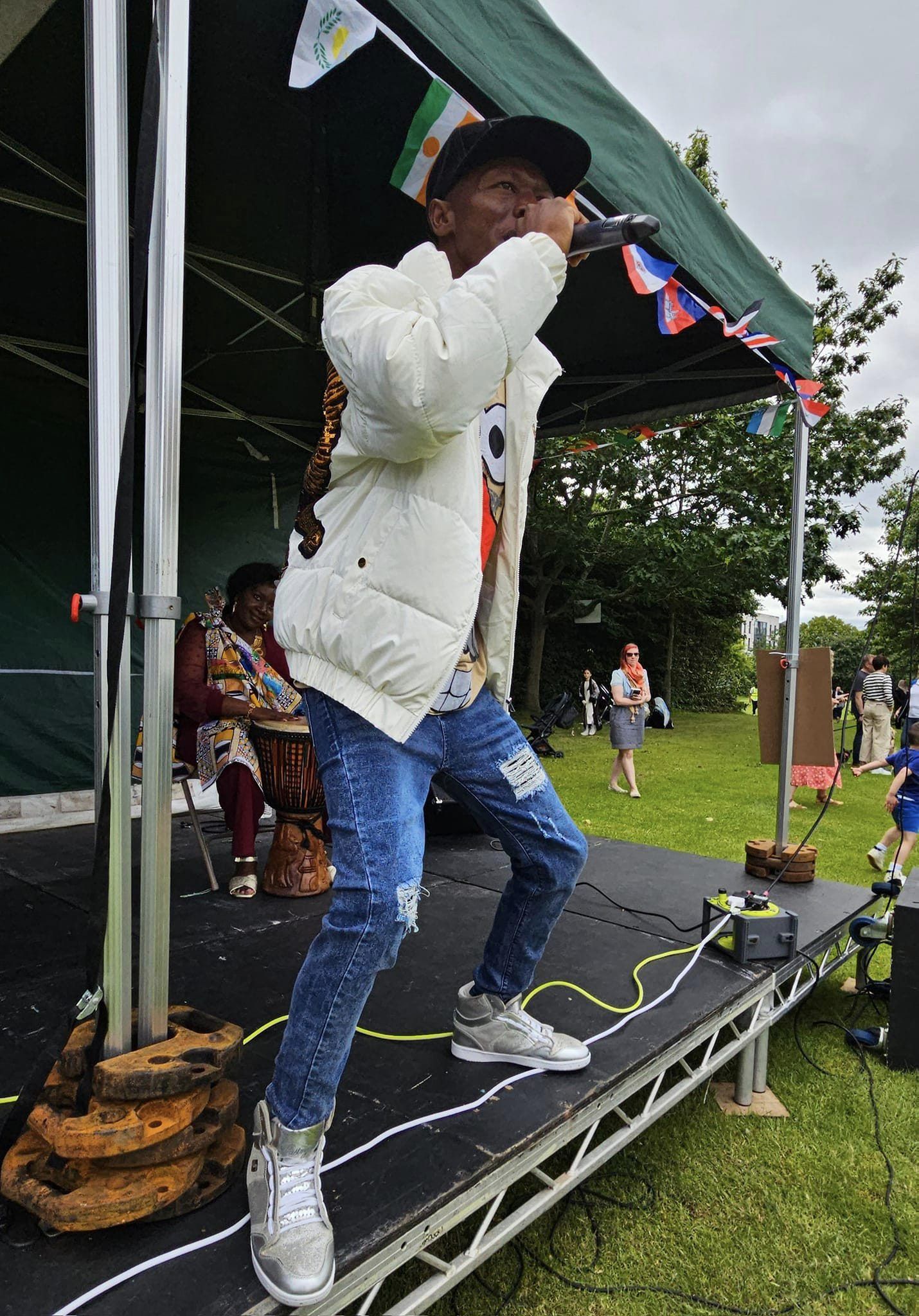I later joined other artists at Show Some Love Belfast where we commemorated the Make Music Day UK. I performed alongside a super talented star Luigi who produced a song about peace and unity, and Behnam (Iran) and Binu (India). It was amazing to freestyle along and just add an African feel to the sound. The drums which in Zambia we call Ingoma are played by a team of artists. This collaboration performance reminded me of this and made me feel at home. We were streamed live around the world as part of the Paris Olympiad music relay with 22 countries.