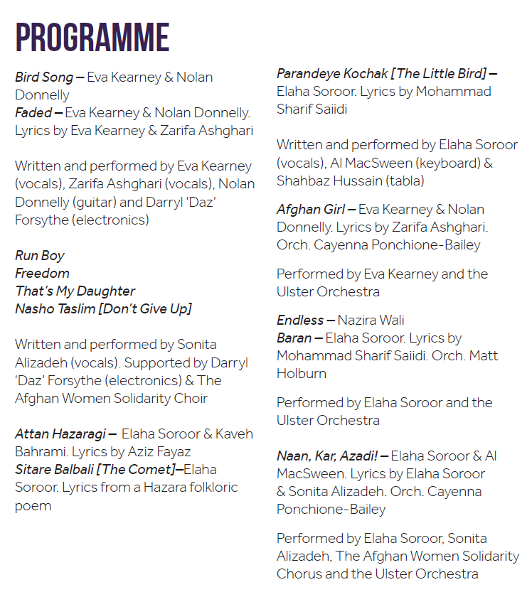 The event that took place on a peace line in Belfast UNESCO City of Music 8th March International Women's Day with the Ulster Orchestra and special guests, represented the greatest number of orchestral works by female artists & composers from Afghanistan ever presented together in a single orchestra concert.