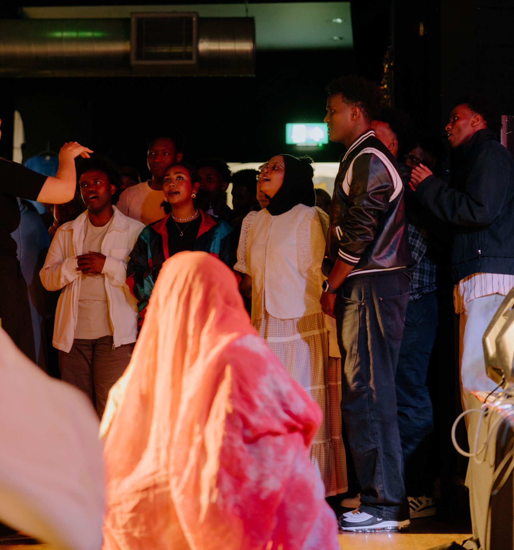 The 18-minute performance featured some vocals and sounds that were sampled on the original track played live. This includes singer and songwriter Claire-Louise McBride singing “Loving You” by Minnie Riperton and the VOYPIC NEW2NI Culture Night Choir singing the sample taken from “Slave to the Rhythm” by Grace Jones conducted by singer Amanda St. John. The choir was specially curated for the performance by the organisation VOYPIC that supports young people in care. Many had escaped war and oppressive regimes.