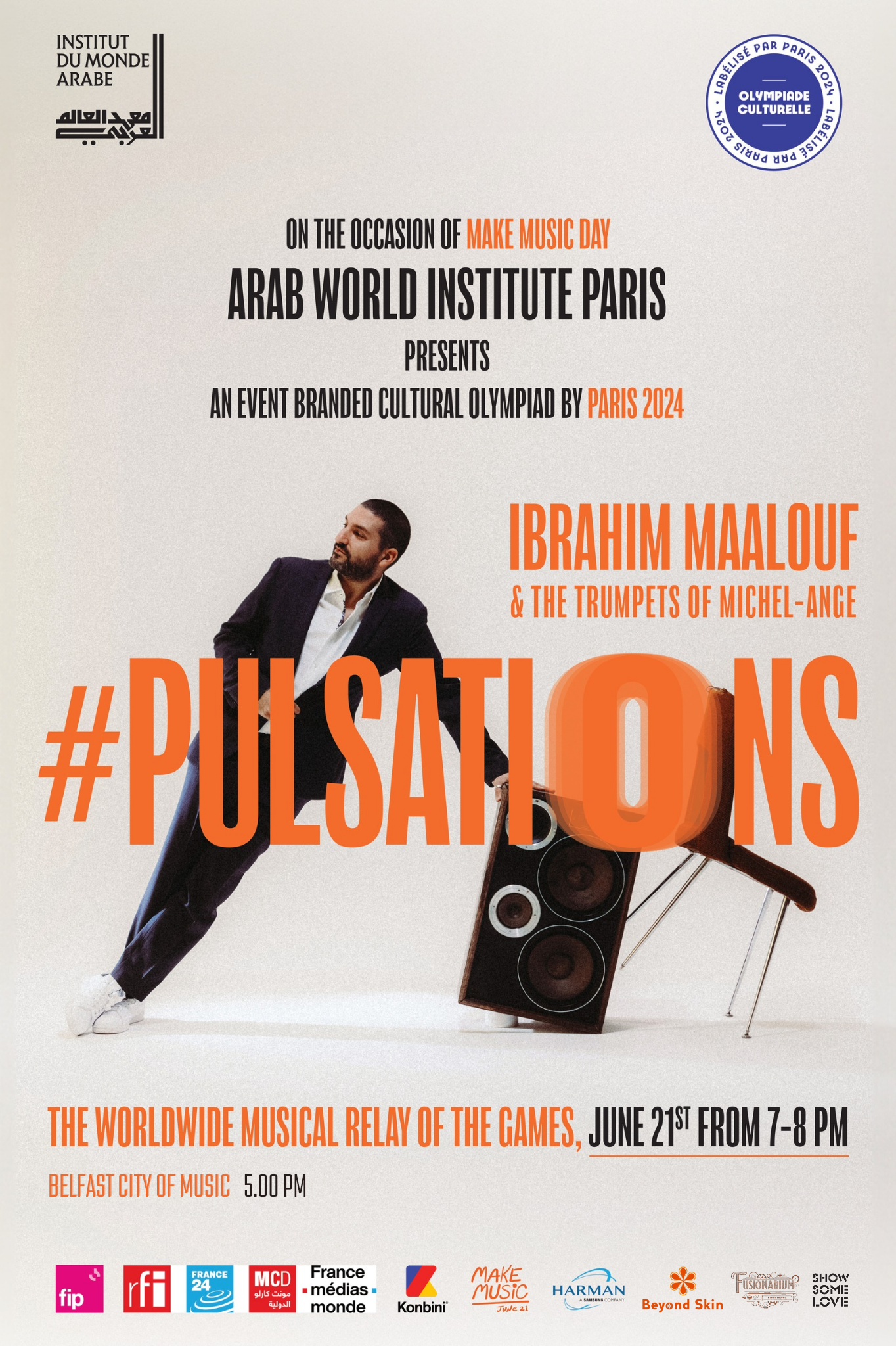 Working together, the Cultural Olympiad of Paris 2024, the Make Music Alliance, the Arab World Institute and Paris 2024 are collaborating to organize “Pulsations,” a rhythmic relay across 24 different countries worldwide. This relay, brimming with surprises, will be inaugurated by renowned trumpeter Ibrahim Maalouf, who will set the rhythm with his melodic heartbeat. This shared rhythm will resonate across various bands and artists in the 24 participating countries, broadcast live on the Make Music Day platform. In Paris, the live stream will grace large screens above the stage of the Arab World Institute, complementing Ibrahim Maalouf live concert in the early evening, culminating in the rhythmic relay.